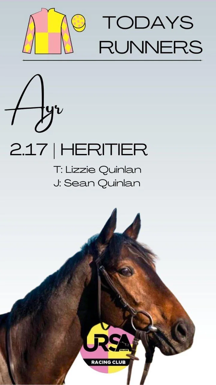 Todays runner we have Heritier up at Ayr- in the 2.17 race heritier looks to get qualified for the Go North One Man Series - A race in which he finished 2nd last year by only one length! Heritier has been a fantastic horse for its owners and with so many 2nd place medals to his name, Deserves a bit luck and hopefully turns them into 1st places!